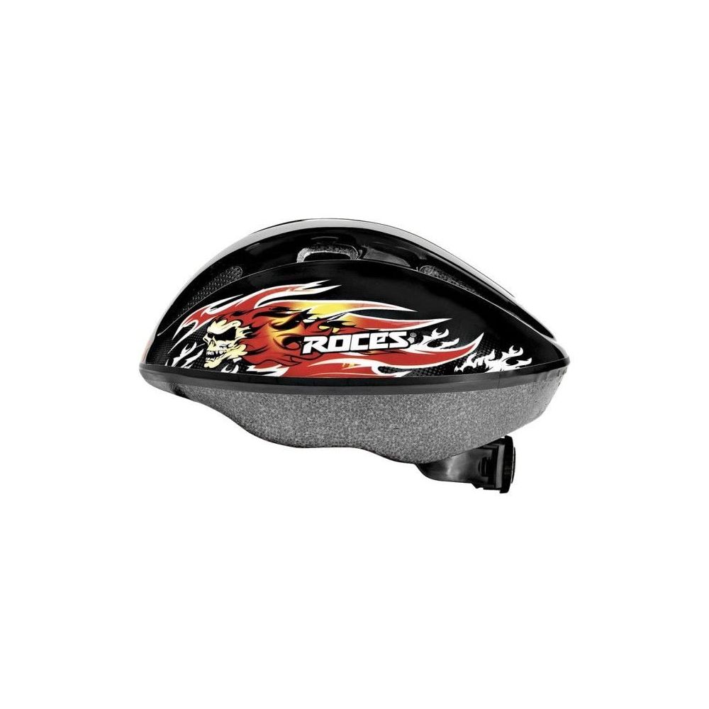 casque Roces noir et rouge motifs flammes, très léger et robuste, pour une pratique des sports de glisse ou velo en toute sécurité. Taille Junior réglable (54-58 cm).