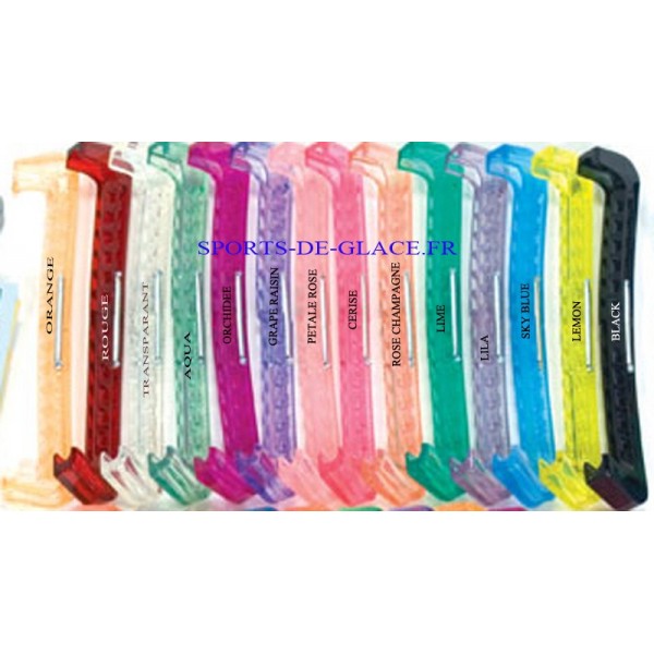 protège-lames en plastique rigide transparent coloré avec ressorts , taille unique, adaptables sur toutes les lames ARTISTIQUE OU DANSE. Notice jointe pour le montage. Utilisez des protège-lames rigides pour ne pas abimer vos lames lors de vos déplacements hors-glace et des protège-lames en tissu pour protéger vos lames des chocs lors du transport.
