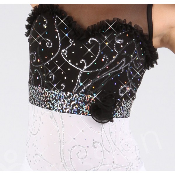 Robe sans manches avec haut du buste mesh lycra noir, tissu noir pailleté avec hologrammes scintillant, bande centrale noire avec sequins irisés puis tissu blanc pailleté avec hologrammes.